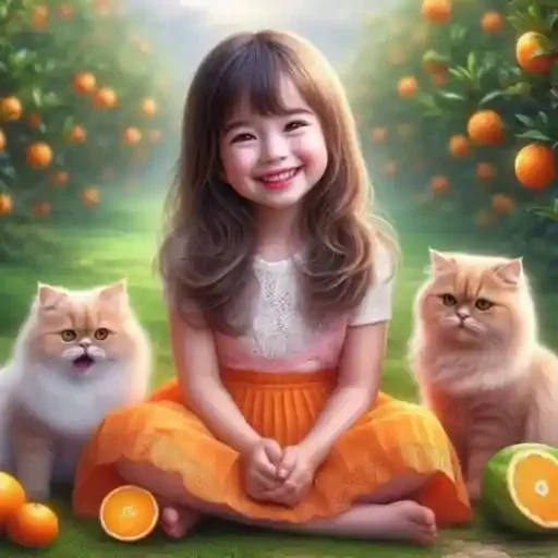 Menina sentada no chão com dois gatos ao lado, em um pomar de laranjas. Ela está sorrindo e usando um vestido laranja e uma blusa branca.