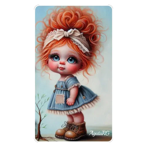Menina com cabelo ruivo encaracolado e faixa na cabeça, vestindo um vestido azul e botas marrons, com um fundo azul claro e uma árvore sem folhas.
