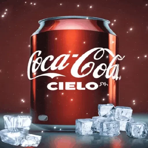 Lata de Coca-Cola Cielo com gelo em volta, fundo vermelho escuro com estrelas de luz.