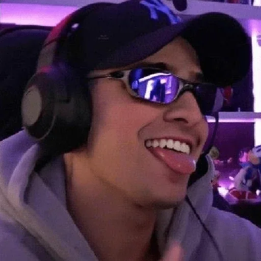 Um jovem com um boné preto e óculos de sol azuis sorri enquanto usa fones de ouvido.