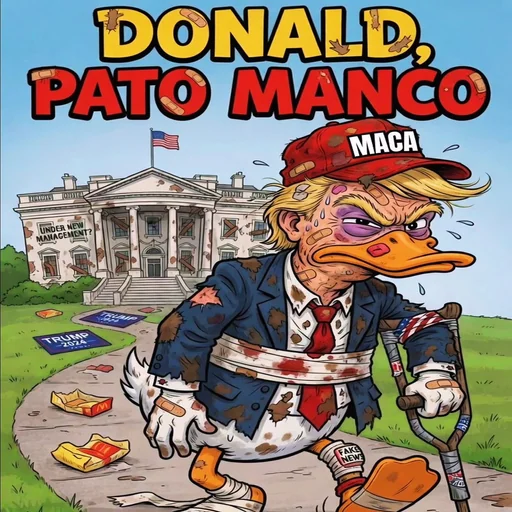 Um pato com características de Donald Trump, usando um boné vermelho com 'MACA' e um terno azul danificado, com bandagens e sangue, carregando uma corrente, em frente à Casa Branca.
