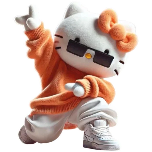 Hello Kitty usando óculos de sol e fazendo um gesto com a mão, vestida com uma blusa laranja e calça branca.