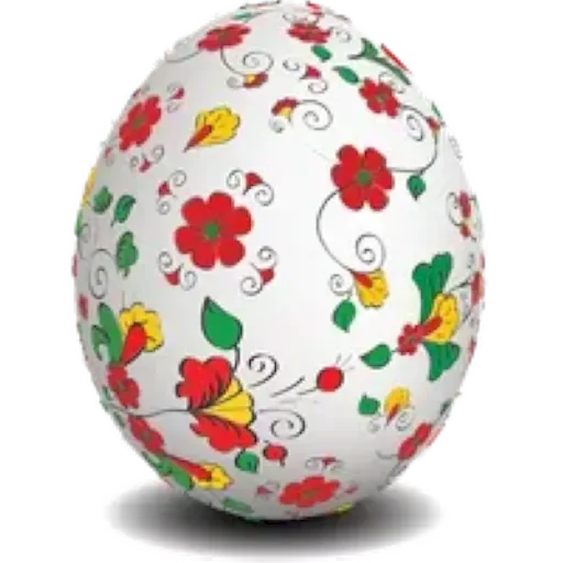 Um ovo branco decorado com flores vermelhas, amarelas e verdes, e folhas verdes. O ovo é adornado com desenhos de flores e folhas entrelaçadas.