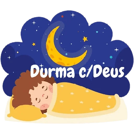 Menina dormindo debaixo de uma nuvem com lua e estrelas, com a frase 'Dürma c/Deus' escrita em cima.