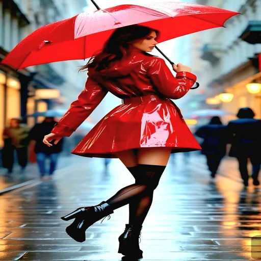 Mulher com capa vermelha e guarda-chuva vermelho andando na chuva, com as costas viradas e perna levantada.