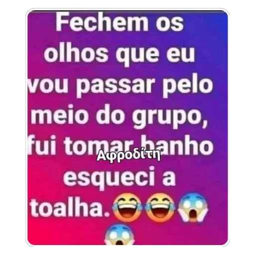 Um texto em fundo rosa e roxo diz 'Fecham os olhos que eu vou passar pelo meio do grupo, fui tomar banho esqueci a toalha.' com emojis de reação.