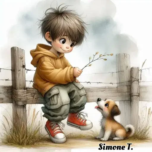 Menino com cabelo castanho claro e olhos castanhos sentados em uma cerca de madeira com um cachorro ao lado. Ele veste um casaco amarelo, calça cinza e tênis vermelho.