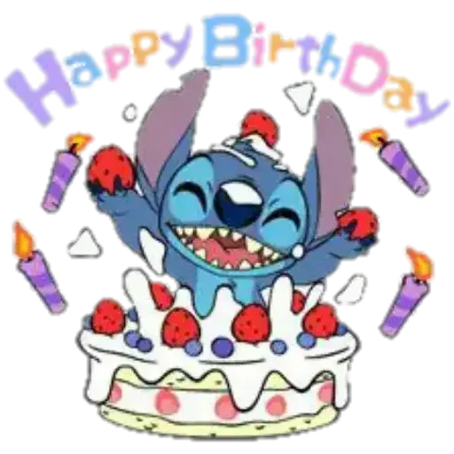 Stitch de olhos fechados e sorrindo em cima de um bolo de aniversário com velas, texto 'Happy BirthDay' acima.