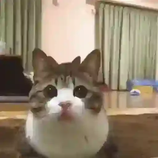 Gato com a cara redonda e olhos arregalados, parecendo surpreso ou confuso, em um ambiente doméstico.