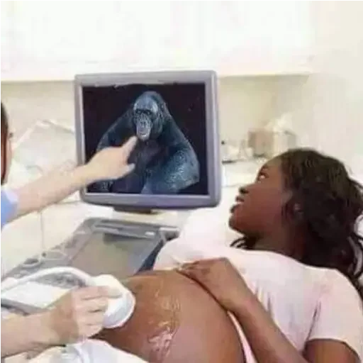 Uma mulher grávida deitada em uma maca, com um aparelho de ultrassom em sua barriga, enquanto um profissional de saúde aponta para a imagem de um gorila na tela do ultrassom.