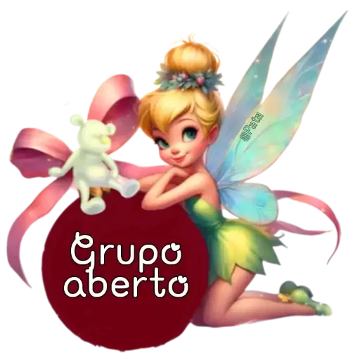 Uma fada com asas azuis e vestido verde segura um guarda-chuva verde com pétalas de flores cor-de-rosa. O texto 'Ótimo…