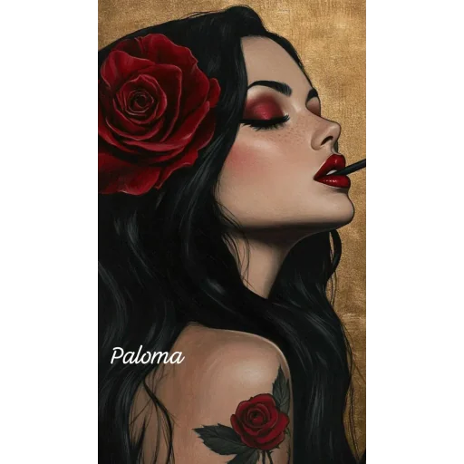 Mulher com cabelo preto e uma rosa vermelha no cabelo, fumando um cigarro. Ela tem uma rosa tatuada no ombro e o nome 'Paloma' escrito em seu corpo.