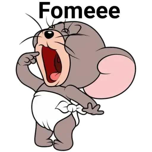 Um rato de desenho animado com uma expressão de fome, usando uma fralda branca e com a boca aberta. A palavra 'Fomeee' está escrita acima dele.