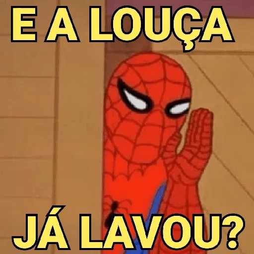 Homem-Aranha com expressão séria e mão levantada, com texto 'E A LOUÇA JÁ LAVOU?' em amarelo.