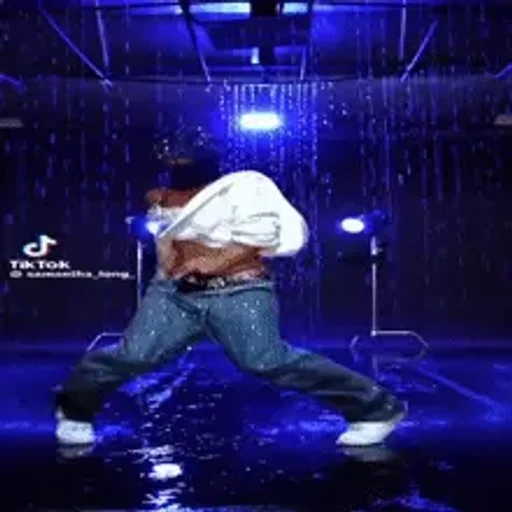 Um homem dançando em um palco com luzes azuis, camisa branca e jeans, com o logotipo do Tik Tok ao lado.