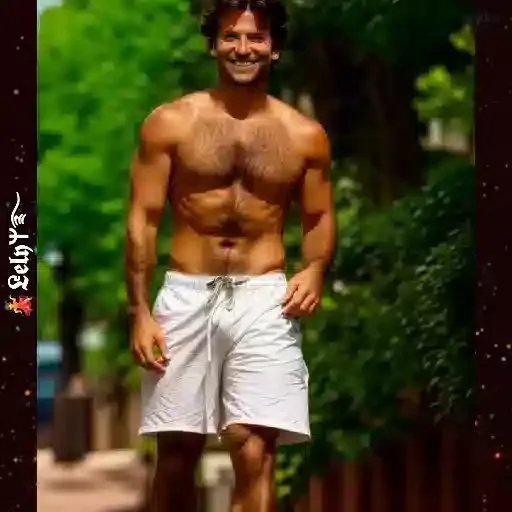 Homem sem camisa, com shorts brancos, sorrindo e ao ar livre em um ambiente com árvores.