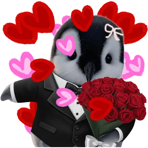 Um pinguim vestido de noivo, com um laço branco no cabelo, segurando um buquê de rosas vermelhas e rodeado de corações vermelhos e rosa.