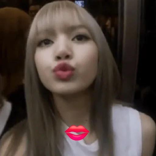 Uma jovem mulher com cabelos loiros longos e franja, vestindo uma camiseta branca, com um lábio vermelho sobreposto ao seu pescoço.