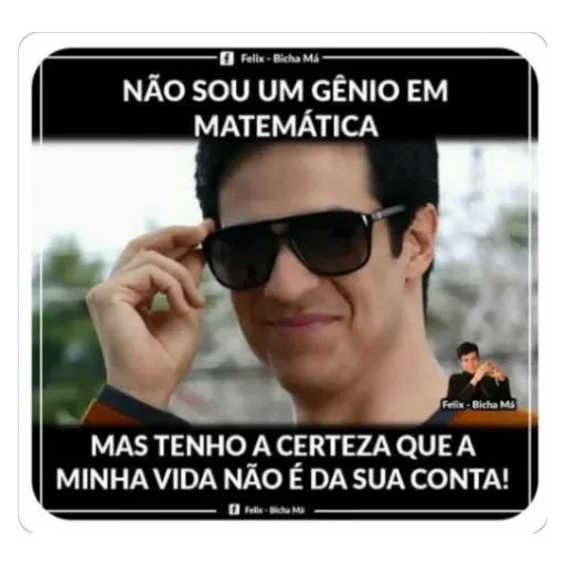 Um homem com óculos escuros e cabelo preto ajustando os óculos, com texto em preto 'NÃO SOU UM GÊNIO EM MATEMÁTICA' e 'MAS TENHO A CERTEZA QUE A MINHA VIDA NÃO É DA SUA CONTA!'