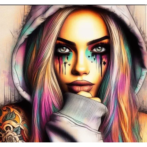 Uma jovem mulher com cabelos coloridos e capuz, com lágrimas nos olhos e uma expressão triste. Ela tem um tattoo no ombro.