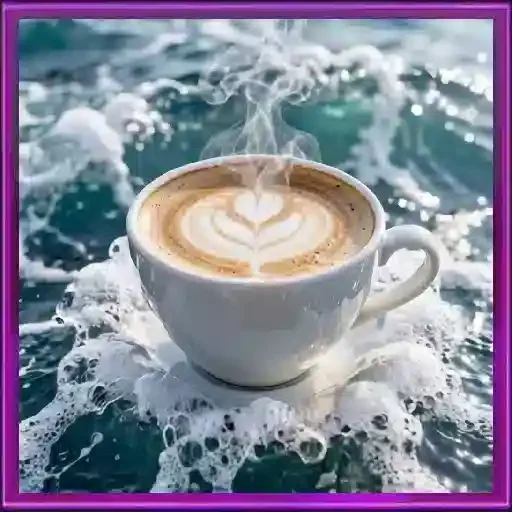 Uma xícara de café com espuma em forma de coração boiando na água com ondas e espuma.
