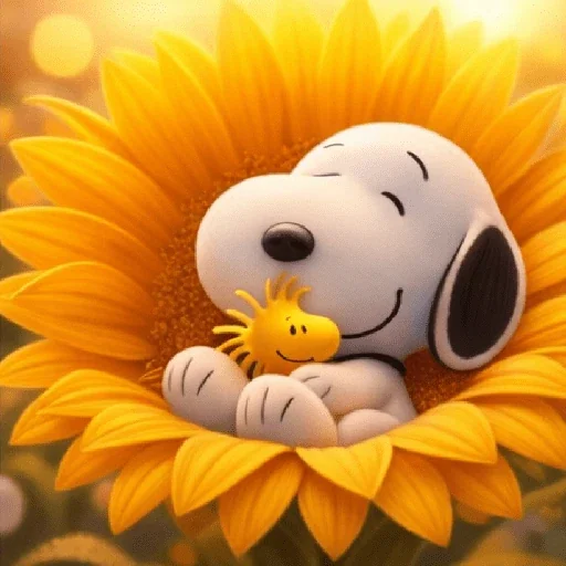 Snoopy e Woodstock abraçados dentro de uma flor amarela grande, com o sol ao fundo. O Snoopy tem um sorriso no rosto e os olhos fechados.