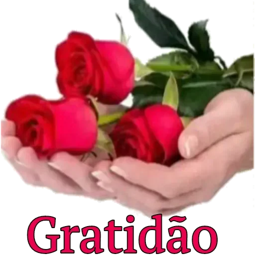 Mãos segurando três rosas vermelhas com folhas verdes e a palavra 'Gratidão' embaixo.