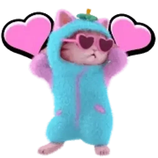 Gatinho rosa usando óculos de sol em forma de coração e um macacão azul com capuz, com asas de coração rosa nas costas.