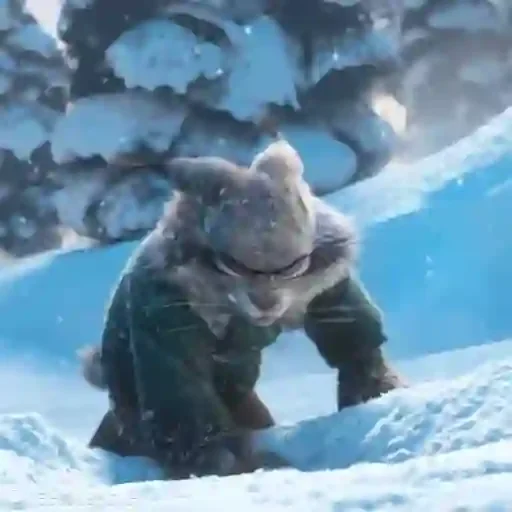 Um personagem de anime, parecido com um lobo ou cachorro, com pelagem cinza e orelhas pontudas, usando um casaco verde e uma gola de pelagem cinza, está ajoelhado na neve. Neve está caindo ao redor.