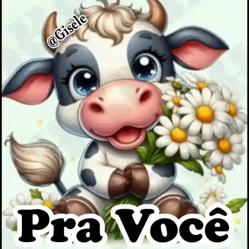 Um bezerro fofinho com manchas pretas e brancas, olhos azuis grandes e um sorriso, segurando um buquê de flores brancas com centros amarelos. Abaixo dele, está escrito 'Pra Você' em letras pretas.