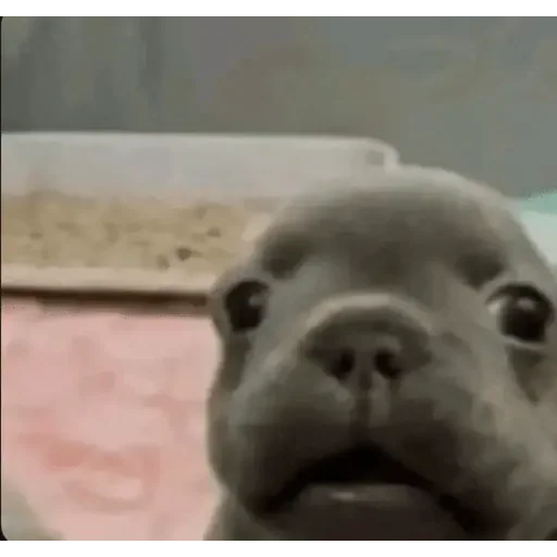 Rosto de um cachorro cinza com expressão surpresa ou assustada, olhos arregalados e focinho franzido.