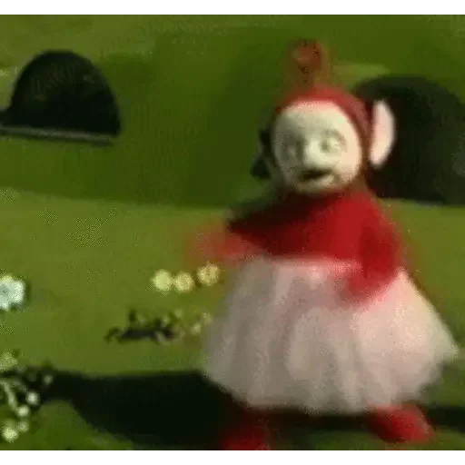 Um personagem de desenho animado vestindo uma tutu rosa e uma camisa vermelha, com uma expressão facial engraçada, em um fundo verde com flores.