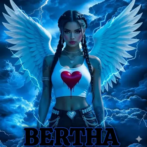 Uma mulher com asas de anjo e cabelos pretos em tranças, vestindo uma blusa branca com um coração vermelho no peito. O fundo é azul com raios. O nome 'BERTHA' está escrito em preto na parte inferior.