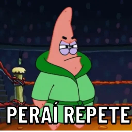 Patrick Star com óculos e um casaco verde, expressão facial séria, em um ringue de boxe com o texto 'PERAÍ REPETE' na parte inferior.