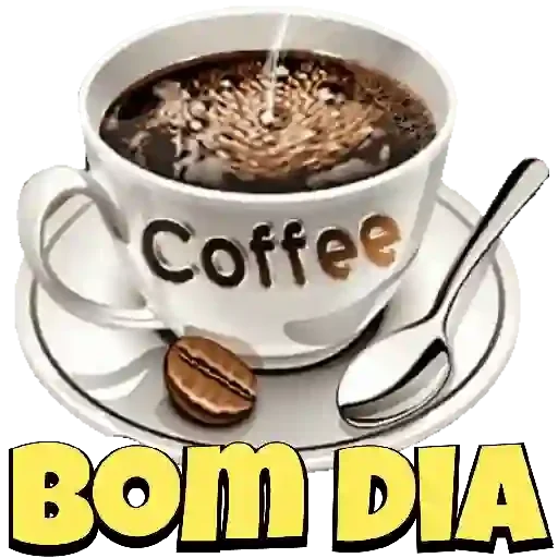 Uma xícara de café com o texto 'Coffee' escrita na lateral, acompanhada de um grão de café e um colher, com o texto 'BOM DIA' em destaque na parte inferior.