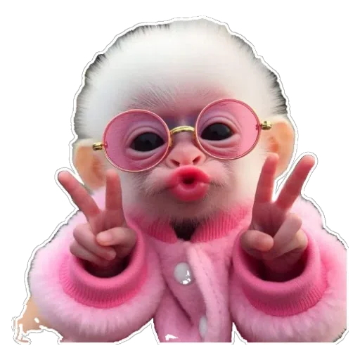 Um macaco bebê com óculos cor-de-rosa fazendo um gesto de paz com as mãos. Ele está usando um casaco rosa.