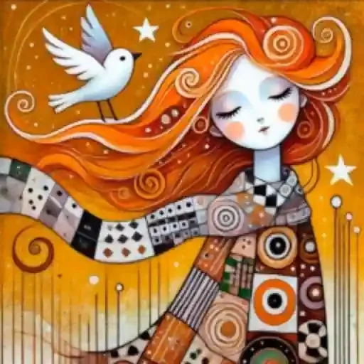 Uma mulher com cabelos laranjas longos e ondulados, olhos fechados e um pássaro branco voando ao lado. Ela veste uma roupa com padrões geométricos coloridos.