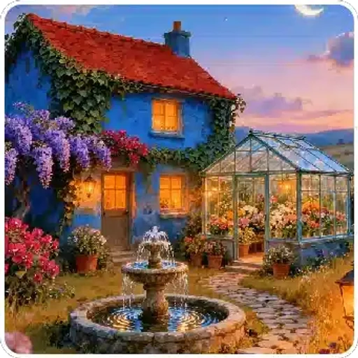 Uma casa azul com telhado vermelho e uma varanda coberta de plantas, com um jardim e uma estufa ao lado. Ao fundo, um céu com tons de rosa e azul.
