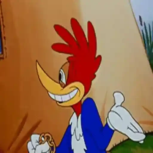 Um pica-pau cartoon com penas vermelhas, bico amarelo e um bigode branco, vestindo um blazer azul e uma camisa branca, sorrindo e segurando um objeto na mão esquerda.