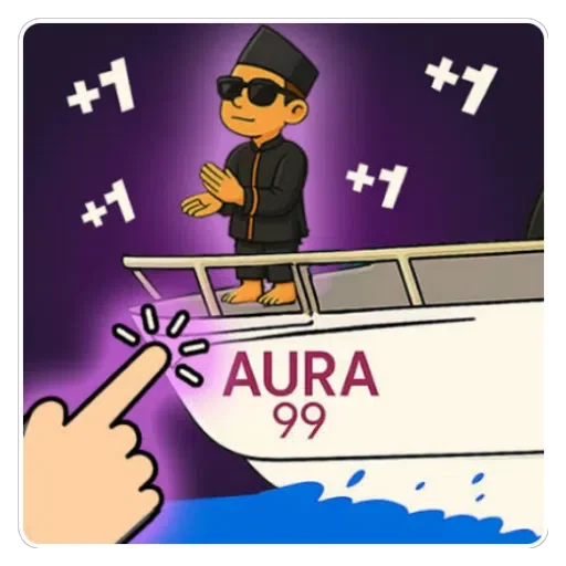 Um personagem de anime com óculos escuros e um chapéu preto está em um barco branco com o texto 'AURA 99' enquanto uma mão aponta para ele. O fundo é roxo com símbolos de '+1'.