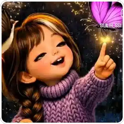 Menina de cabelos castanhos e trança, com suéter roxo, aponta para uma luz brilhante com uma expressão de surpresa e admiração. Fundo escuro com faíscas e uma borboleta roxa no canto.