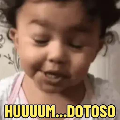 Menina com expressão de desconfiança ou surpresa, olhos semicerrados e boca aberta. Legenda 'HUUUUM...DOTOSO'