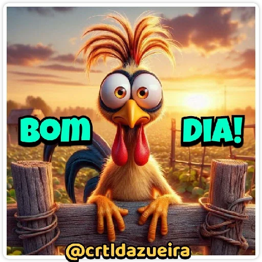 Um galo cartoon com expressão engraçada e olhos arregalados, com o texto "Bom Dia!" em letras verdes. O cenário é um pôr do sol em um campo.