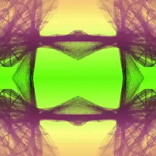 Uma figura geométrica abstrata com tons de roxo, verde e amarelo. A imagem apresenta um centro verde brilhante cercado por formas simétricas.