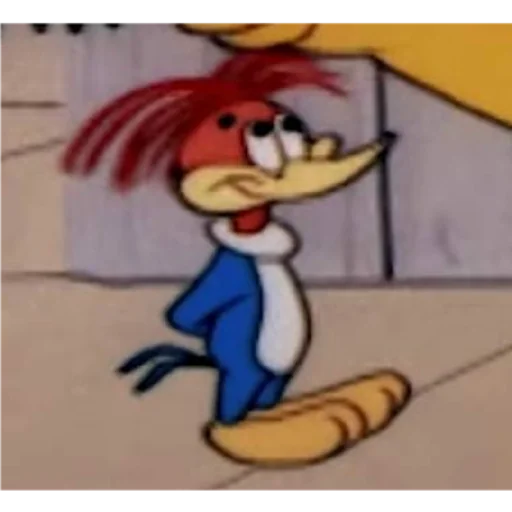 Personagem de desenho animado, pica-pau com cabelo vermelho e roupa azul, com expressão feliz e mão na parede.