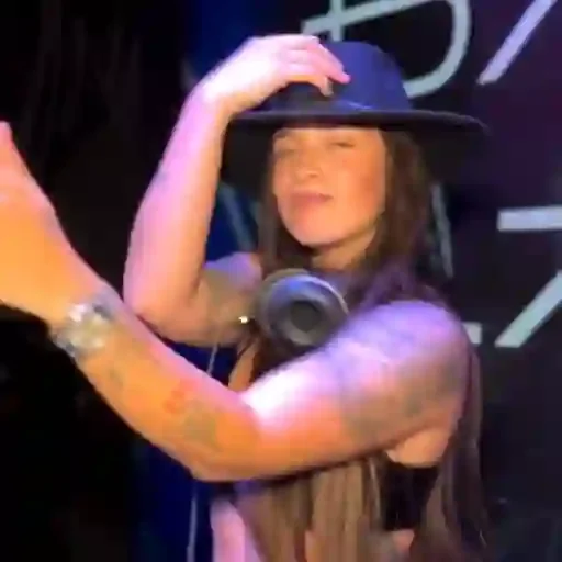 Mulher com chapéu e fones de ouvido fazendo um gesto com a mão.