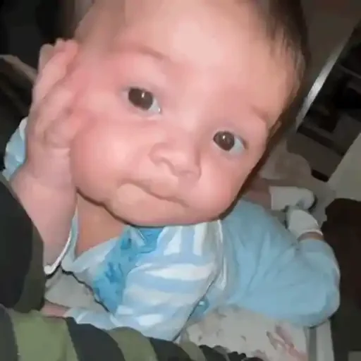 Um bebê com expressão curiosa e mão no rosto, vestindo uma camisa listrada azul e branca.