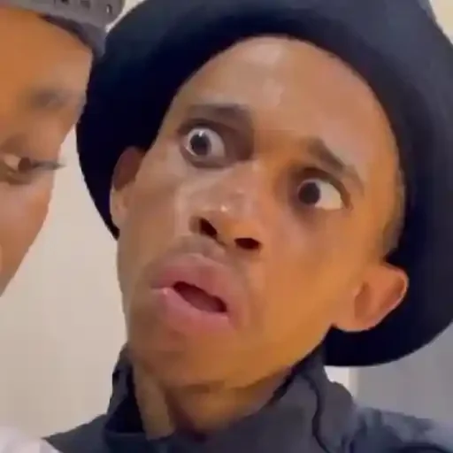 Homem com expressão surpresa, usando um chapéu preto. Outro rosto parcialmente visível ao lado.
