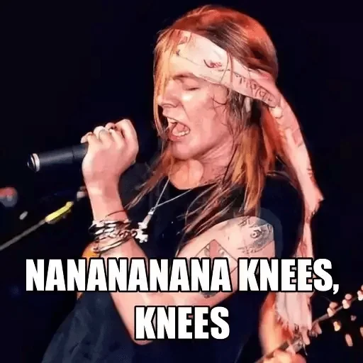 Um homem loiro com bandana e microfone, cantando. Ele tem uma tatuagem no braço e pulseiras. O texto 'NANANANANA KNEES, KNEES' aparece em destaque.