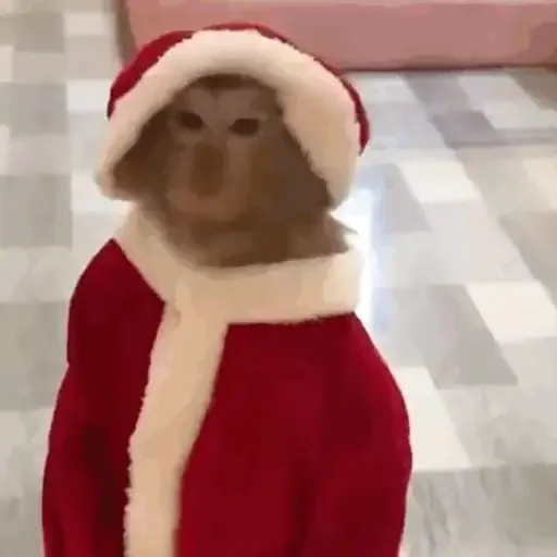Um cachorro vestido com um traje de Papai Noel, com um chapéu e um casaco vermelho e branco.